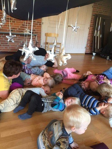 Vi oplever musikken og rytmerne med alle sanser og lærer mange små sange og salmer.